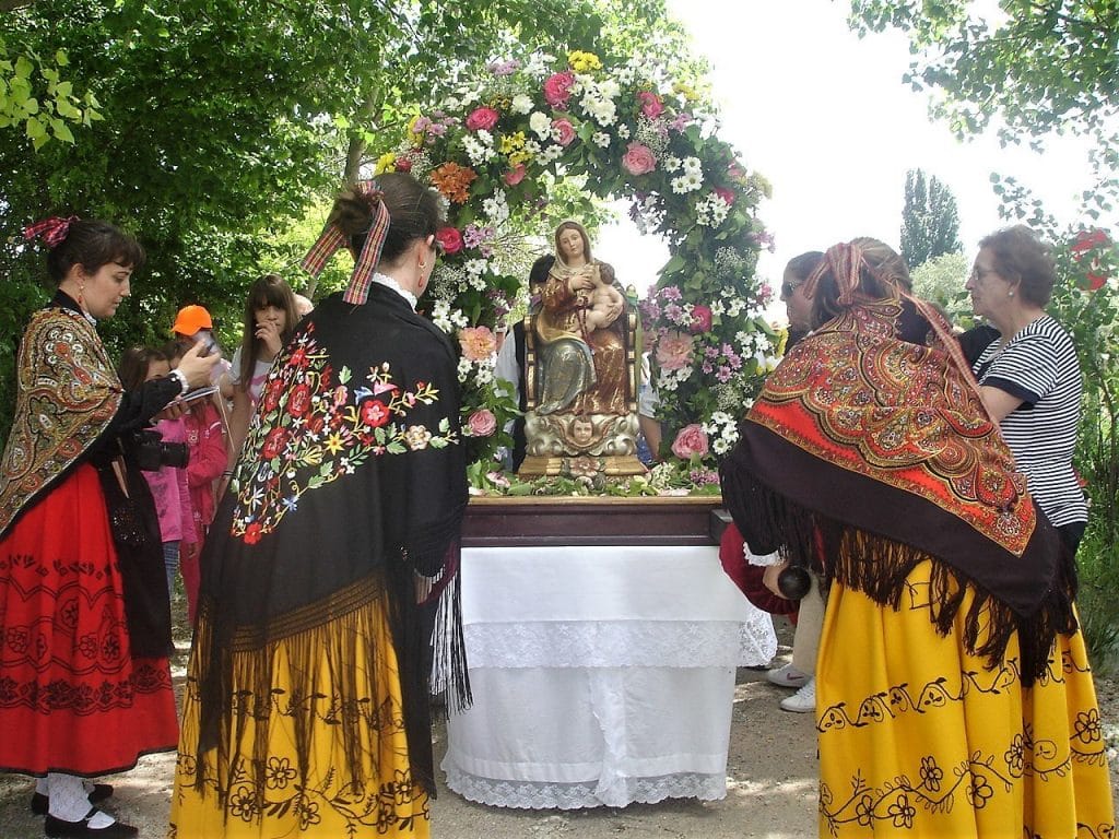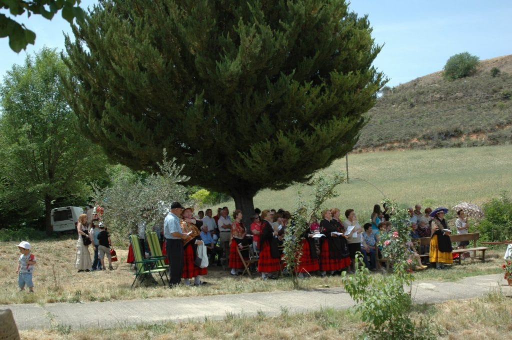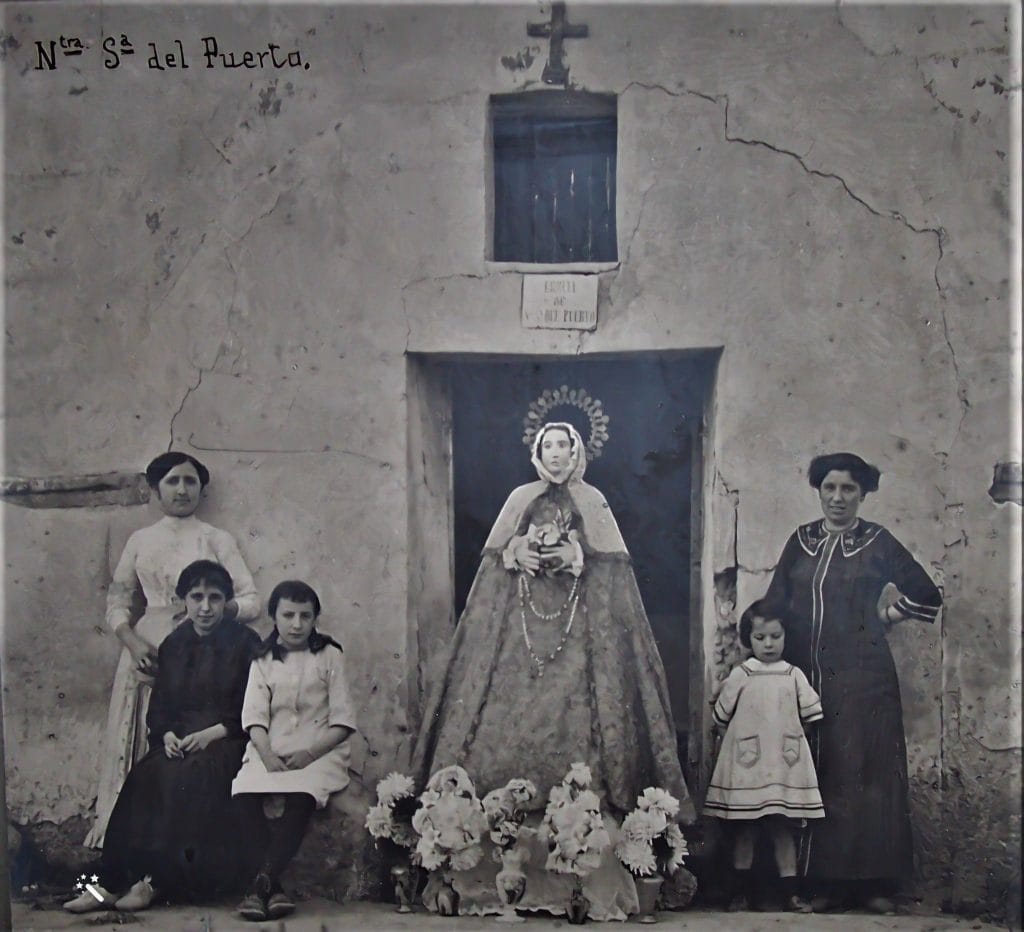 Los nacidos en los 60 somos los últimos que hemos podido ver las ruinas ojivales de templo y monasterio, de cuyas paredes aún quedan testimonios gráficos. No sabemos qué aspecto la talla primitiva de la Virgen, que tuvo que ser anterior al siglo XIV, momento de la fundación de esta comunidad agustina. Tal vez fuera una imagen gótica y se perdiera, como otras reliquias, en una de las muchas guerras que sufrió el convento. Afortunadamente, tenemos una foto de la Virgen que veneró la generación de mis abuelos: se trata de una imagen de vestir, del siglo XIX, que era muy del gusto del pueblo. La fotografía está hecha en la puerta de la ermita en 1915. Sobre el dintel se puede ver un azulejo en el que pone “Ermita de la Virgen del Puerto” y un ventano por el que se veía la luz que iluminaba perpetuamente a la imagen.La ermita quedó destruida en la Guerra Civil, así como la talla de la Virgen y en la primera mitad de los 60 el sacerdote del pueblo puso otra imagen y se procedió a arreglar la ermita, cuyas obras se terminaron en 1967. En octubre de ese año se trasladó, en una procesión iluminada con velas, la imagen desde la iglesia del pueblo hasta la ermita, al caer la tarde.La costumbre de la romería a la Virgen del Puerto podemos suponer que se iniciara, asimismo, en los 60, por iniciativa del sacerdote don Pablo Julián, que estuvo en Salmerón bastantes años. Antes de eso, parece que en el mes de mayo bajaban las niñas de la escuela con la maestra a merendar en este lugar. La primera crónica de una “peregrinación” a la ermita en la prensa es de septiembre de 1966, pues la fiesta de la Virgen, como tantas otras, se celebraba el 8 de dicho mes, día de la Natividad de María.Crónicas concretas de la romería aparecen en la prensa en septiembre de 1969 y mayo de 1970, año en que se trasladó la fiesta a la primavera y que incluso allí mismo se cantaron los “Mayos” a la Virgen. Todas están firmadas por Valentín Fernández Cuevas, periodista natural de Auñón, pero que tuvo casa y residió en nuestro pueblo por aquellos años.La ermita, tras la reconstrucción terminada en el 67, presentaba un recinto cerrado, de planta cuadrangular, enfoscado de cemento y con una puerta de zinc por cuyo ventano se podía ver la imagen. Sobre el dintel, un letrero, esta vez de madera, anunciaba la titularidad del mínimo santuario. Fuera de él había poyos para el asiento del visitante y enfrente, una mesa de piedra hecha con una rueda de molino y rodeada de bancos de piedra.A principios de los 90 se procedió a una nueva intervención en la ermita y se descubrió la piedra de sus cuatro muros, en cada uno de los cuales había un vano con arco. Se decidió, no sé si con acierto, dejar el edificio abierto, sólo protegido con rejas. A la vez, con el fin de evitar saqueos y deterioros se compró una Virgen de piedra, un busto de líneas renacentistas, poco adecuado a la piedad popular. ´Poco después se retomó la costumbre de celebrar una romería, pero ya trasladada al último fin de semana de mayo. De entonces data la costumbre de acompañar a la Virgen desde el pueblo a la ermita con el traje típico alcarreño. Hace ya algo más de diez años el pueblo compró una hermosa talla de la Virgen del Puerto, inspirada en la de la misma advocación de Plasencia. Esta se venera todo el año en la iglesia parroquial de Salmerón y sólo baja a la ermita el día de su fiesta.Os dejo imágenes de las distintas épocas de la ermita y de la romería, así como las noticias de prensa que hacen referencia a ella.