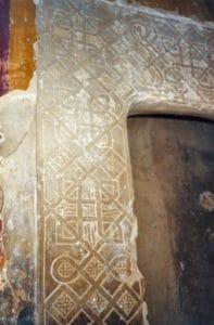 Durante la restauración del templo se descubrio este relieve de yeso en torno a la puerta que desde la nave central del templo subía a la torre.Fue destruido.